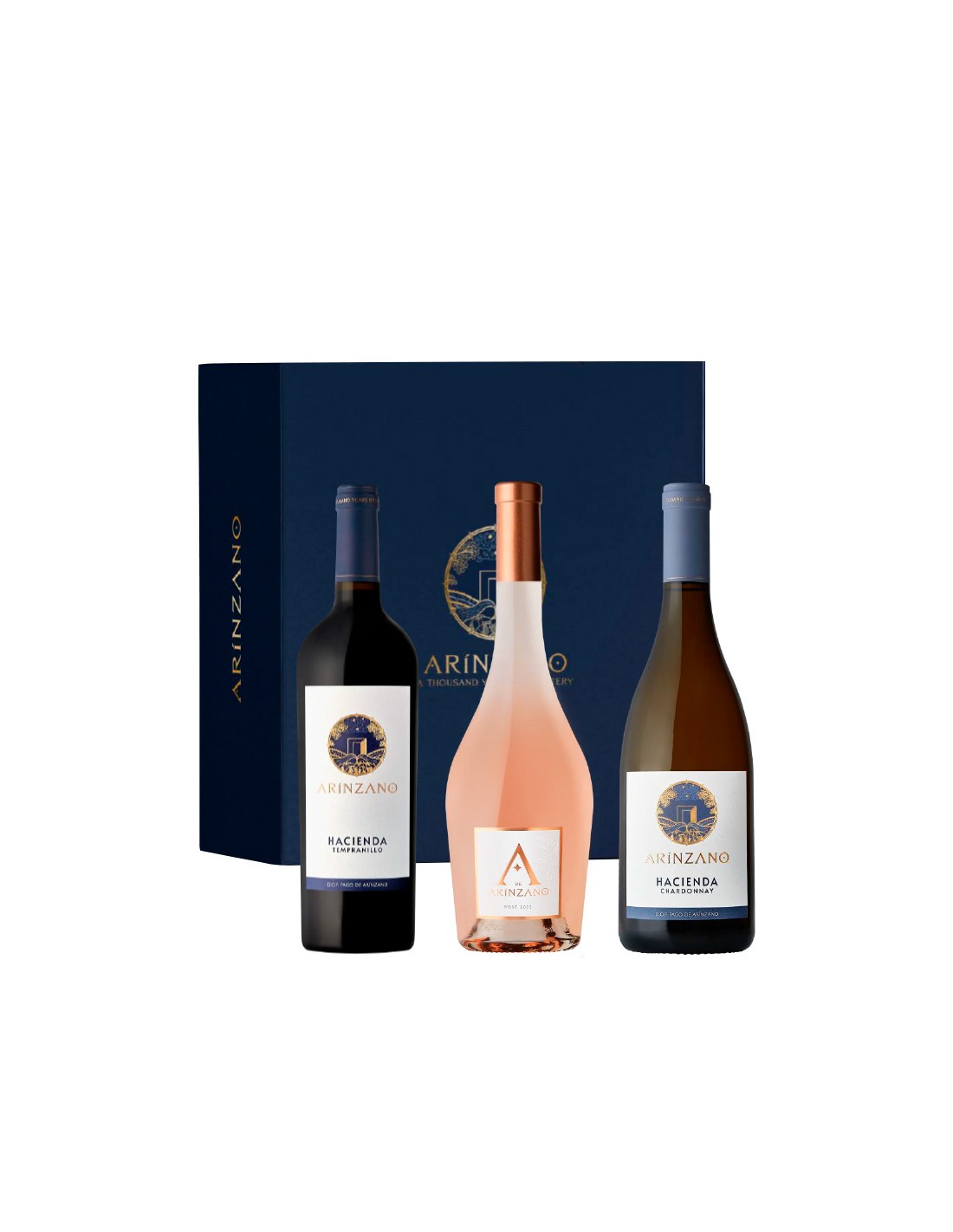 1 Botella A de Arínzano Rosé 2024 + 1 Botella de Hacienda de Arínzano Blanco 2022 + 1 Botella Hacienda de Arínzano Tinto 2020 + 1 Estuche de Cartón 3 Botellas Arínzano