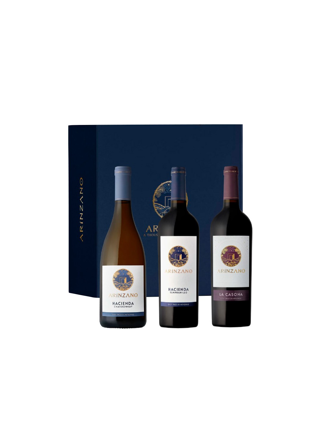 1 Botella Hacienda de Arínzano Blanco 2022 + 1 Botella Hacienda de Arínzano Tinto 2020 + 1 Botella Arínzano La Casona 2020 + 1 Estuche de Cartón 3 Botellas Arínzano